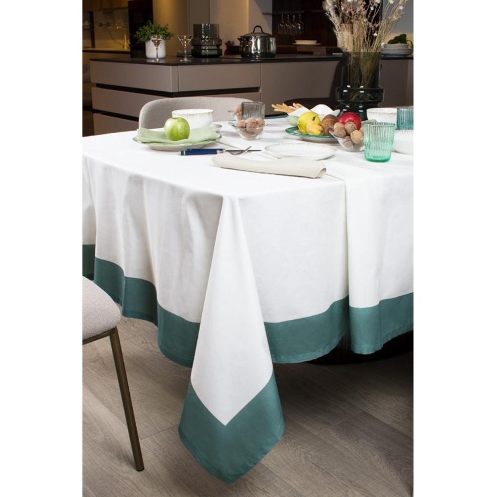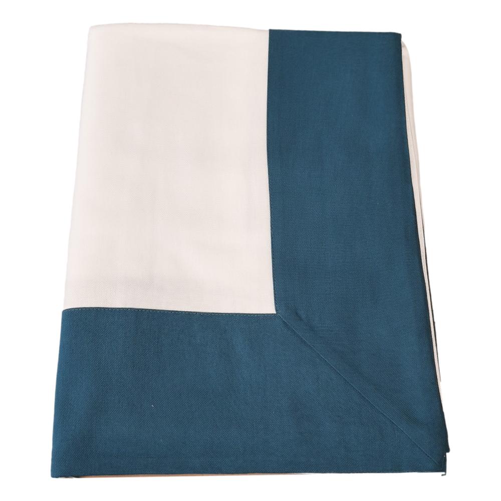 Tovaglia in panama di puro cotone, colore bianco con balza a contrasto colore petrolio. disponibile nelle misure 150x270cm e 150x360cm
