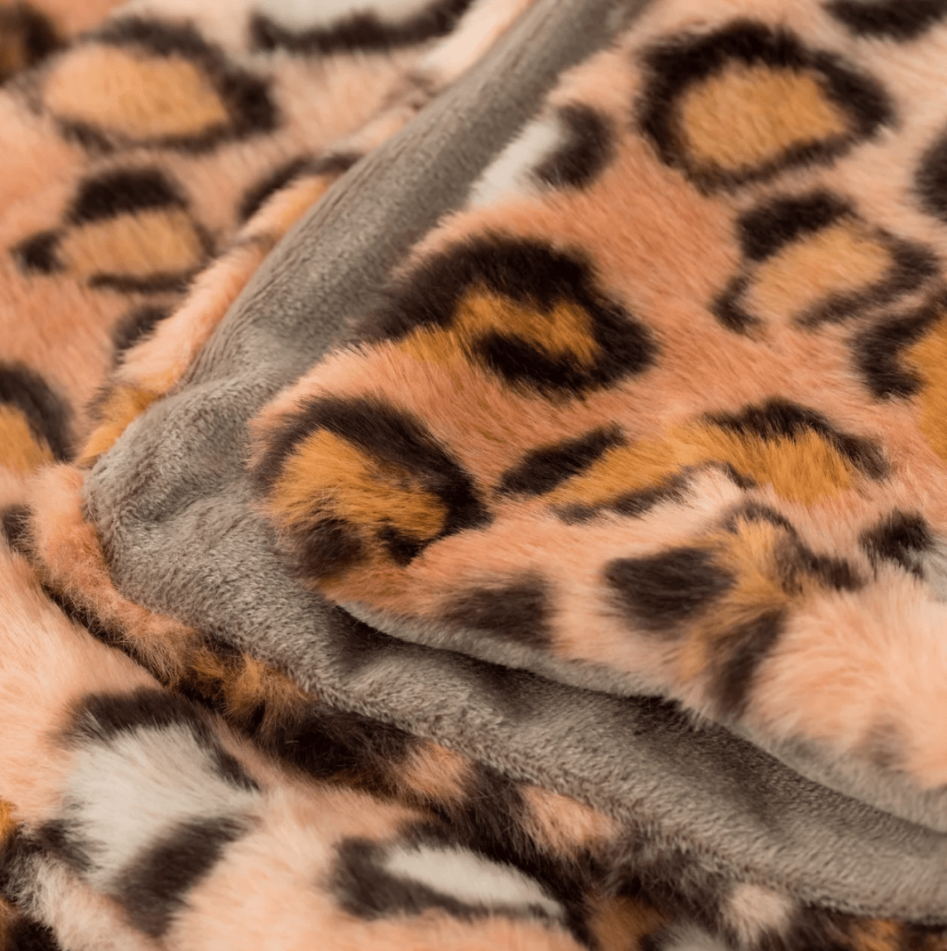 Plaid con motivo animalier, fronte in ecopelliccia e retro in velluto. Morbido, avvolgente e di grande impatto visivo, è ideale per divano o letto. Dimensioni 210×240 cm.